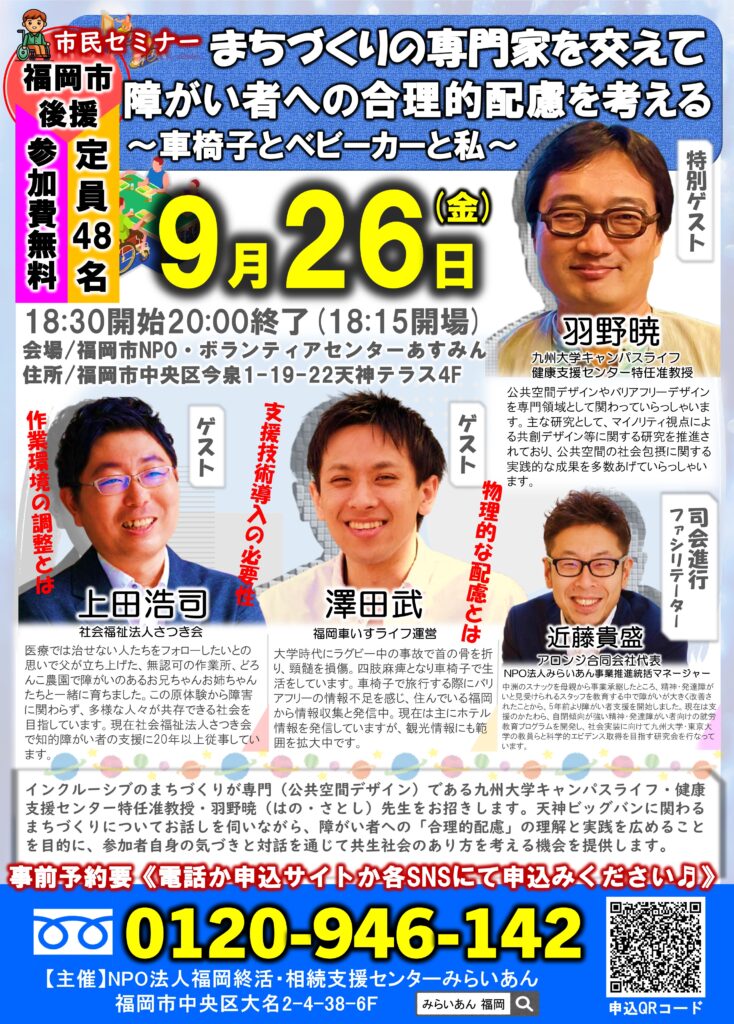 インクルーシブのまちづくりが専門(公共空間デザイン)である九州大学キャンパスライフ・健康支援センター特任准教授・羽野暁(はの・さとし)先生をお招きします。天神ビッグバンに関わるまちづくりについてお話しを伺いながら、障がい者への「合理的配慮」の理解と実践を広めることを目的に、参加者自身の気づきと対話を通じて共生社会のあり方を考える機会を提供します。