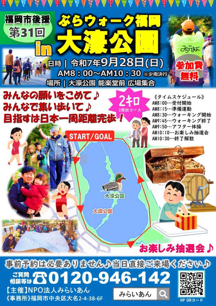 《注意事項》🚩雨天中止のお知らせは、各SNSサイトで分かり次第お知らせします。🚩ご記入頂いた個人情報は、当イベント以外には使用しません。🚩ウォーキング中、体調不良等の不測の事態が起こった際には、お近くのみらいあん実行委員に申し出てください。🚩時間が多少変更する可能性がございますので、ご了承ください。🚩イベント中は、貴重品を必ず手元に置き、盗難・紛失には十分にご注意ください。当イベント内で起こった盗難・紛失であっても、主催者は一切の責任を負いかねます。🚩当イベントでは、写真・ビデオの撮影及び録音を行います。主催者および共催者等が 、今後の広報活動等において使用しますので、予めご了承ください。
